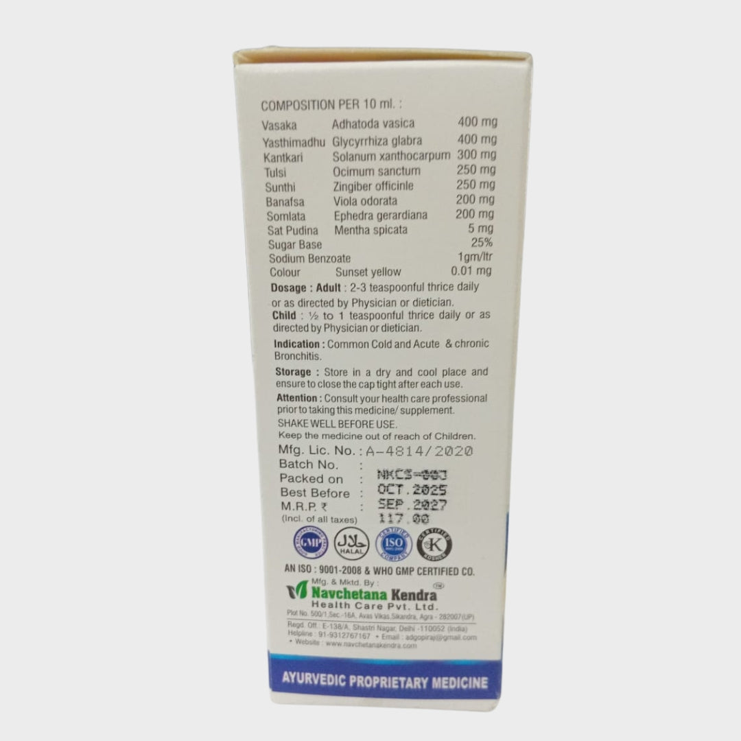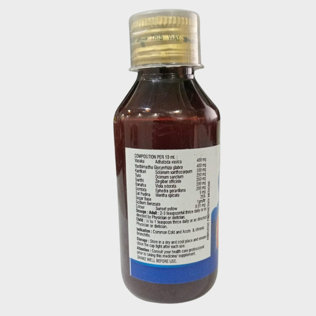Cough Syrup is an Ayurvedic/herbal formulation that provides quick relief from dry and productive cough, sore throat, and throat irritation. Enriched with natural ingredients like Tulsi, Mulethi, Vasaka, and Ginger, it helps soothe the throat, clear mucus, and support easy breathing.